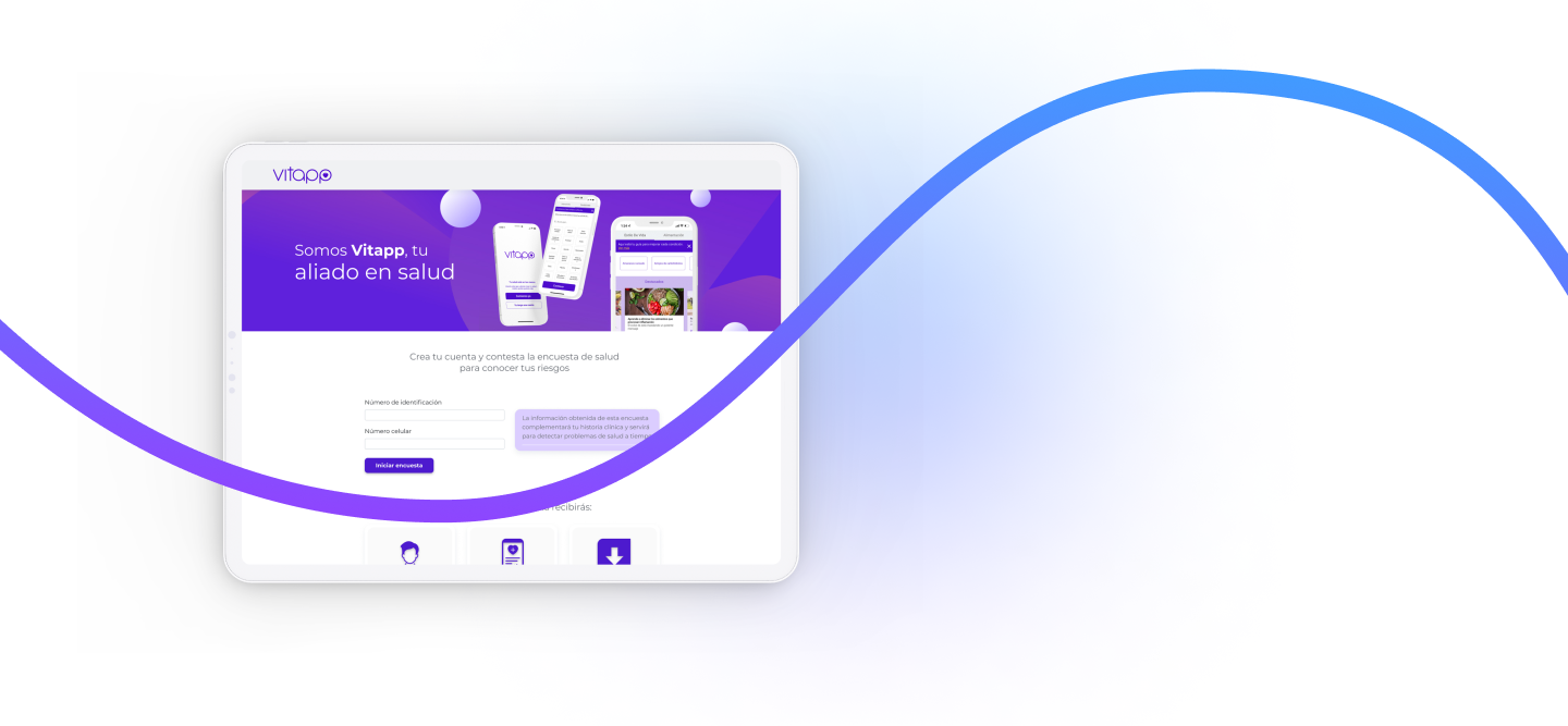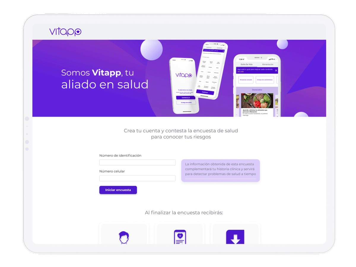 Es la entrada al servicio Vitapp. Una encuesta de 3 minutos que evalúa factores que implican riesgo, así nuestro médico analiza las respuestas y entrega el plan personalizado.
