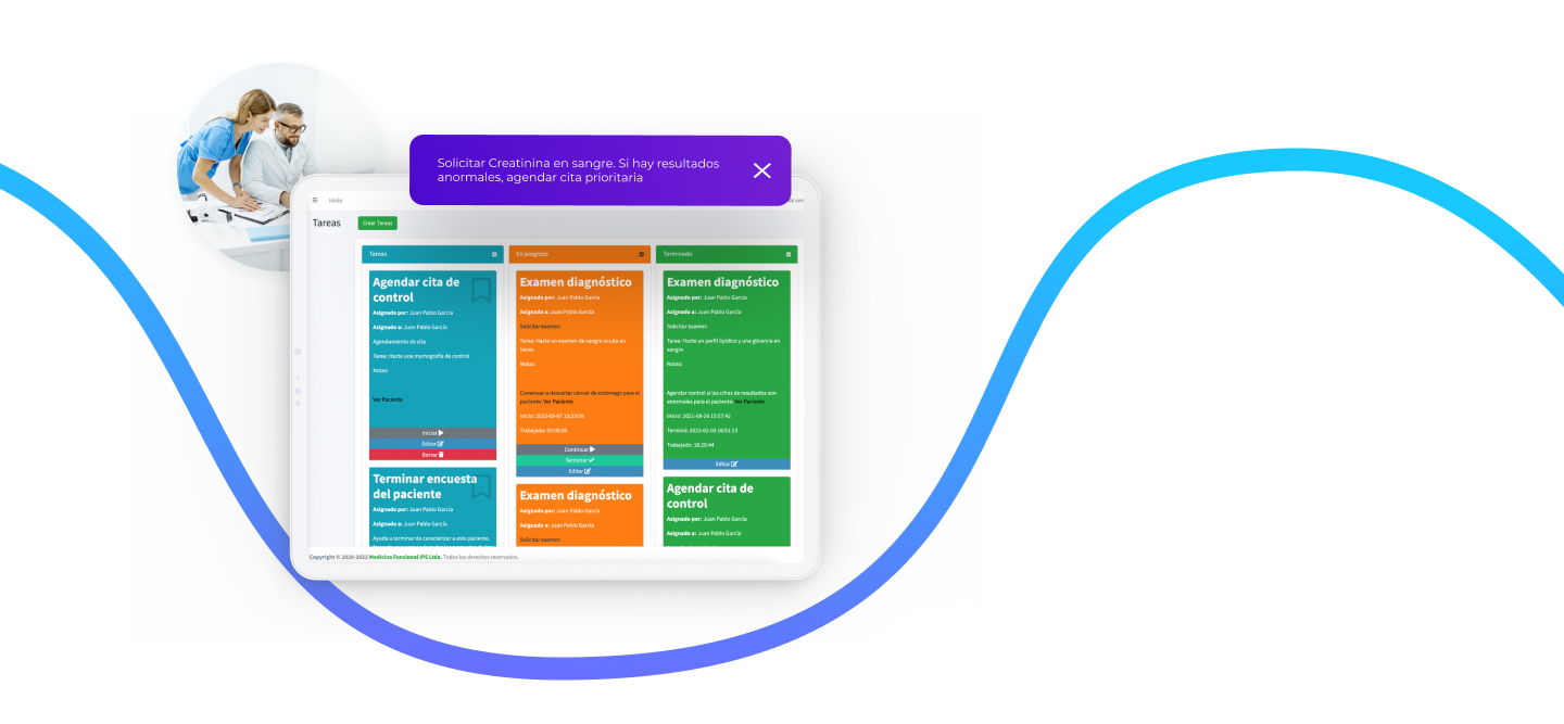 Nuestro equipo médico investiga los riesgos en salud de cada persona. Se apoya en un algoritmo que sospecha el riesgo de más de 500 segmentos de patologías distintas y genera preguntas para calcular las probabilidades del riesgo. Los riesgos altos llevan a sugerir exámenes paraclínicos para su confirmación o descarte.